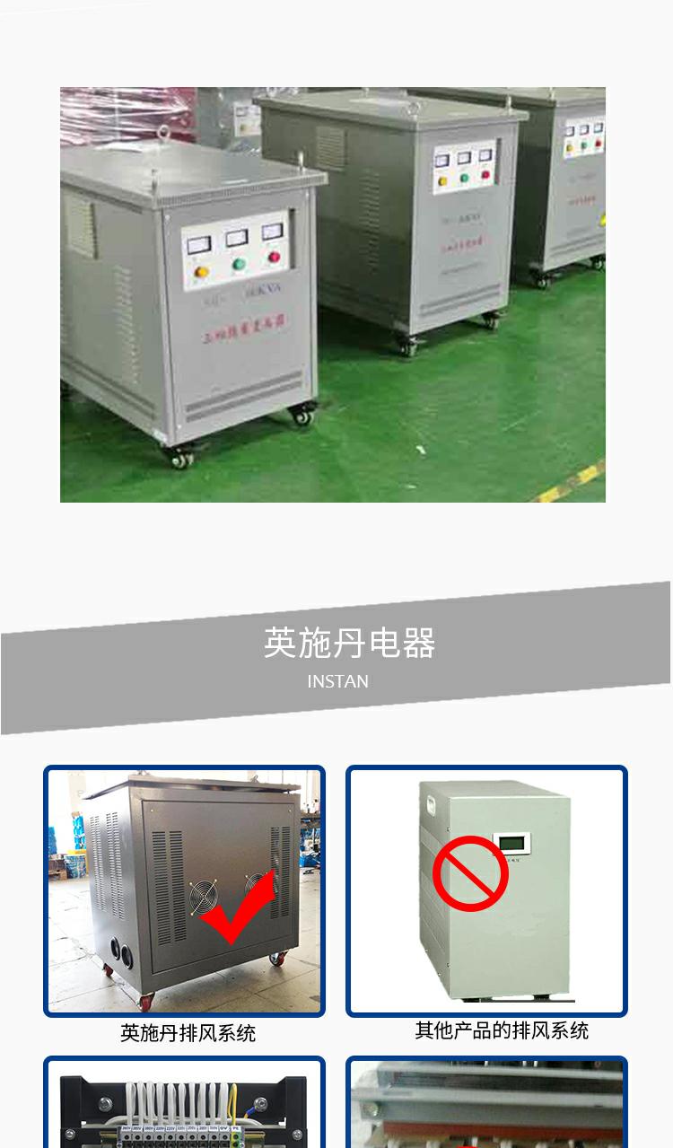 >产品使用范围: 英施丹隔离变压器分单相(DG)与三相(SG)系列,主要的作用是将用电设备和电网隔离开.用于安全性场合或者抗干扰(多采用D/Y、D/Yn △/Yo或Yo/ △连接 )要求的场合等,用电设备和电源没有直接的电联系。广泛用于地铁、高层建筑、机场、车站、码头、工矿企业及隧道的输配电及进口、出口设备的使用等场所。 英施丹SG系列三相干式变压器(380V变压器)主要用于各种高低压成套电气、进出口设备、精密机床、UPS、电镀、照明、加热、通信、化工等行业设备的控制电力、电源之用。