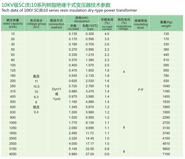 干式变压器SCB10-250KVA315KVA400KVA500KVA630KVA800KVA1000KVA/KW10KV/0.4V多少钱一台¥?什么价格?工厂直线:021-51095208热线:4006855086 SCB10树质绝缘千式变压器是我公司引进国外先进技术, 由于线圈被环氧树脂包封,所以难燃,防火体积小,可直接安置在负荷中心。同时科学合理的设计和浇注工艺,电小,噪声低,散热能力强,在强迫风冷条件下可以在125%额定负载下长期运行,并配有智能温控仪,具有故障报警,超温报警,朝闻挑着,以及黑匣子功能,并通过RS485串口与计算机相连,可以集中监视和控制。  产品结构: 高压绕组 高压绕组用带填料环氧树脂真空浇注,局放量小,线圈电气强度高,绕内外壁用玻璃纤维网络格板增强,增加了线圈的机械强度,提高了产品抗突短路的能力,线圈永不开裂。 低压绕组 低压绕组采用箔式结构,解决了用线绕时轴向螺旋角问题,使安匝更s同时线圈采用轴向冷却风道,增强了败热能力,绕组层间采用了DMD环氧预漫布,整体固化成形。 铁芯 铁芯造用进口优质冷轧硅钢片,三阶金斜接结构、芯柱果用F级无模礼、铁芯表面采用环氧树醒包封,降低了空载损耗,空载电流和铁芯城央件和紧固件经持殊表面处理,使产品外观质量有了进一步提高, 温控系级和冷风系统 采用横流顶吹式冷却风机,该冷却风机具有噪声小,风压高,外形美观等特点,增强了变压器的过载能来。温度控制采用智能温控仪,提高了变压器运行可靠性。 产品特点: 1.安全,防火,无污染,可直接运行于负荷中心; 2.采用国内先进生产技术,机械强度高,抗短路能力强,局部放电量小,热稳定性好,可靠性高,使用寿命长; 3.低损耗,低噪音,节能效果明显,免维护; 4.散热性能好,过负载能力强,强迫风冷时可提高50%容量运行; 5.防潮性能好,适应高湿度和其他恶劣环境中运行; 6.体积小,重量轻,占地空间少,安装费用低。