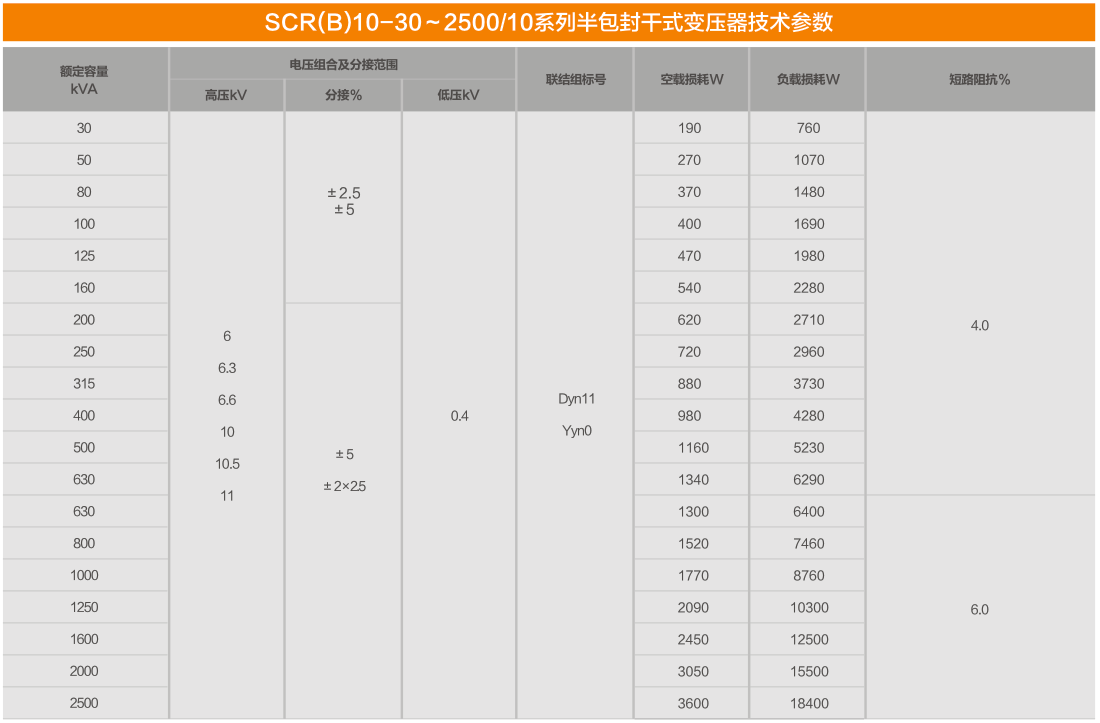 产品特点• 防尘、防潮:外表喷涂专用防水材料,形成防尘、防潮、防污染的特殊保护层。 • 体积小,重量轻:采用杜邦NOMEX纸为主绝缘材料,与同等容量的环氧浇注式变压器相比,体积和重量减少20%。 • 散热能力强::多层圆筒式、纵向多气道结构,与环氧浇注式变压器相比散热效果更优。 • 环保:可靠,无助燃性树脂,无毒,可以分解回收,不污染环境。 使用条件海拔≤1000m,-25℃≤环境温度≤40℃,户内式。对空气自冷与强迫风冷的变压器,均需保证变压器具有良好的通风能力。当变压器安装在地下室或其他通风能力较差的环境,须增设散热通风装置。保护等级有IP00、IP20、IP23等型式。当海拔>1000米时或是环境温度大于40℃或者小于-25℃时,产品须按照GB1094.11《电力变压器第11部分:干式变压器》的要求对有关额定值作相应调整。 技术参数