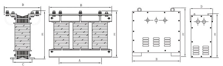 二、型号及其含义 三、外型及安装尺寸 | 型号 | 外形尺寸(开启式) | 安装孔距 | 外形尺寸(防护式) 英施丹集团 | | B × D × E | A × C | B × D × E 英施丹集团 | | SG/SBK-1KVA | 200×150×210 | 180×120 | 310×280×300 英施丹集团 | | SG/SBK-1.5KVA | 240×150×230 | 180×120 | 350×300×360 英施丹集团 | | SG/SBK-2KVA | 240×160×230 | 180×150 | 350×300×360 英施丹集团 | | SG/SBK-3KVA | 250×180×230 | 180×170 | 350×300×360 英施丹集团 | | SG/SBK-4KVA | 300×180×280 | 220×180 | 400×350×410 英施丹集团 | | SG/SBK-5KVA | 300×200×280 | 220×200 | 400×350×410 英施丹集团 | | SG/SBK-7KVA | 380×200×350 | 280×180 | 500×400×480 英施丹集团 | | SG/SBK-8KVA | 380×220×350 | 280×190 | 500×400×480 英施丹集团 | | SG/SBK-10KVA | 380×240×350 | 280×220 | 500×400×480 英施丹集团 | | SG/SBK-15KVA | 420×220×400 | 280×220 | 600×500×580 英施丹集团 | | SG/SBK-20KVA | 420×240×410 | 280×260 | 600×500×580 英施丹集团 | | SG/SBK-30KVA | 480×260×460 | 320×260 | 600×500×580 英施丹集团 | | SG/SBK-40KVA | 530×320×500 | 320×280 | 750×600×720 英施丹集团 | | SG/SBK-50KVA | 530×350×520 | 450×260 | 750×600×720 英施丹集团 | | SG/SBK-80KVA | 630×400×580 | 450×280 | 850×650×820 英施丹集团 | | SG/SBK-100KVA | 720×500×650 | 550×350 | 950×700×850 英施丹集团 | | SG/SBK-200KVA | 850×550×700 | 600×400 | 1100×800×1000 英施丹集团 | | SG/SBK-300KVA | 1000×650×800 | 680×420 | 1200×800×1100 英施丹集团 |