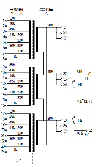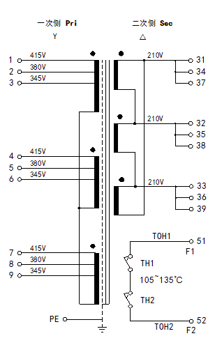概述(低损耗型三相干式安全隔离变压器H级180℃绝缘等级): 变压器是各种电源及电气设备的主要部件,隔离变压器由圆筒式绕组和迭片式铁芯组成,铁芯采用 全新优质高硅硅钢片叠装,全斜接缝。本公司采用先进的制作工艺,有进口马克斯高速自动绕线机和全套真空压力浸漆设备;绕组采用脱胎整列绕制方法;对变压器进行真空浸漆,使变压器的绝缘等级达到F级或H级。变压器的输出和输入电压可按客户需求设计。有单相、三相或多路输入和输出等多种规格。