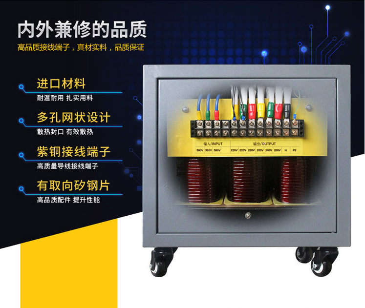 变压器的调压:一般不在低压侧调压。 原因:1.低压线圈被包在高压绕圈的里面,从低压侧抽出抽头很难;2.高压侧流过的电流小,可以使引出线和分接开关载流部分的截面小一些,发热的问题也较容易解决。 实例:Un±5%或Un±2*2.5%,说明有3个或5个分接头可供选择。 如图的变压器SF31500/220±2*2.5%型的变压器,主抽头电压为220kV,其他4个抽头的电压分别为:与额定电压偏差为+5%(231kV),+2.5%(225.5kV),-2.5%(214.5kV),-5%(209kV)。 抽头式变压器多档位调节测试变压器技术参数 容量:0.5KVA-1600KVA 输入电压:380V 输出电压:1440V 1140V 690V 660V 480V 460V 440V 415V 400V 380V 220V 200V 127V 110V 100V 48V 36V 24V 12V 电压变动率:±1 输出波形失真:无失真(与输入波形比较) 绝缘等级:F级、H级(常规为H级)耐温180° 工作效率:98 适用频率:50/60Hz 联接方式:Y/ Y/Y Dyn11 Dzn0 过载能力:允许超过1.5倍额定负载工作1小时(可长期满载) 噪 声:35dB(一公尺内) 温 升:60 绝缘电阻:150MΩ 抗电强度:3000VAC/1min 设计寿命:20年 工作环境:温度:-20+50湿度:95RH不结露 工作场所:无腐蚀性气体及导电粉尘 安规标准:产品符合VDE0550, IEC439、JB5555、GB226等国际国家标准 冷却方式:干式风冷 备货情况:常规380V/220V有现货具体请联系客服